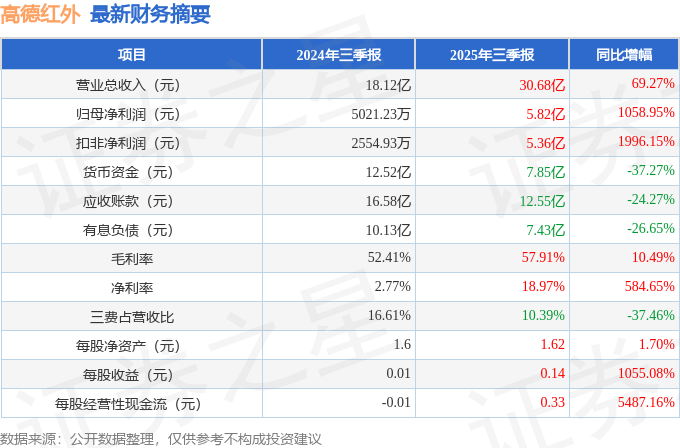 据证券之星公开数据整理,近期高德红外(002414)发布2025年三季报。截至本报告期末,公司营业总收入30.68亿元,同比上升69.27%,归母净利润5.82亿元,同比上升1058.95%。按单季度数据看,第三季度营业总收入11.34亿元,同比上升71.07%,第三季度归母净利润4.01亿元,同比上升1143.72%。本报告期高德红外盈利能力上升,毛利率同比增幅10.15%,净利率同比增幅584.65%。
