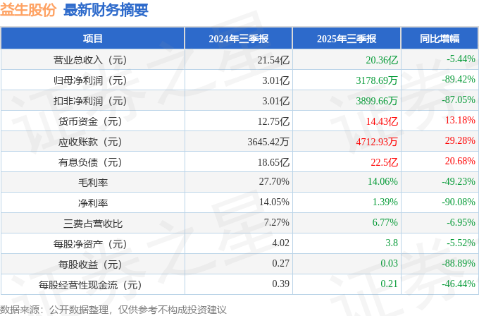 据证券之星公开数据整理,近期益生股份(002458)发布2025年三季报。根据财报显示,益生股份净利润同比下降89.42%。截至本报告期末,公司营业总收入20.36亿元,同比下降5.44%,归母净利润3178.69万元,同比下降89.42%。按单季度数据看,第三季度营业总收入7.15亿元,同比下降8.04%,第三季度归母净利润2563.18万元,同比下降78.2%。