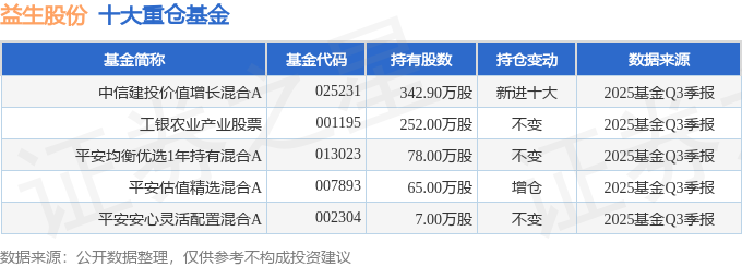 持有益生股份最多的基金为中信建投价值增长混合A,目前规模为7.34亿元,最新净值1.1972(10月28日),较上一交易日下跌0.56%。该基金现任基金经理为冷文鹏。