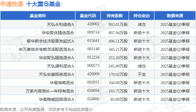 持有申通快递最多的基金为天弘永利债券A,目前规模为21.36亿元,最新净值1.2223(10月28日),较上一交易日下跌0.01%,近一年上涨4.75%。该基金现任基金经理为姜晓丽 张寓。