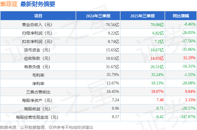 据证券之星公开数据整理,近期索菲亚(002572)发布2025年三季报。截至本报告期末,公司营业总收入70.08亿元,同比下降8.46%,归母净利润6.82亿元,同比下降26.05%。按单季度数据看,第三季度营业总收入24.57亿元,同比下降9.88%,第三季度归母净利润3.62亿元,同比上升1.44%。本报告期索菲亚应收账款上升,应收账款同比增幅达32.29%。