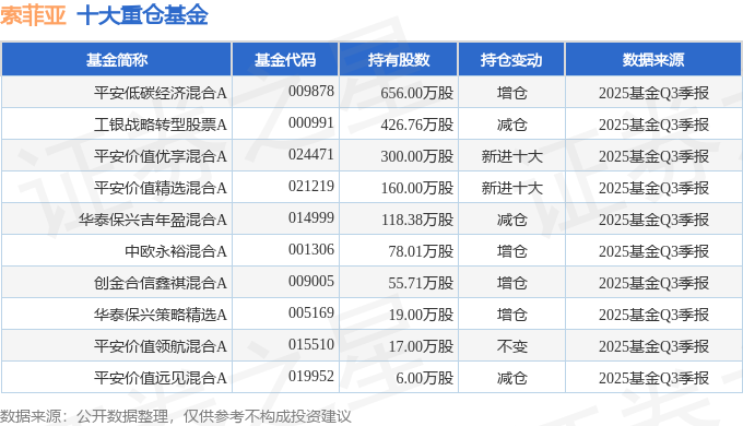 持有索菲亚最多的基金为平安低碳经济混合A,目前规模为14.51亿元,最新净值1.1788(10月28日),较上一交易日下跌0.36%,近一年上涨21.85%。该基金现任基金经理为何杰。