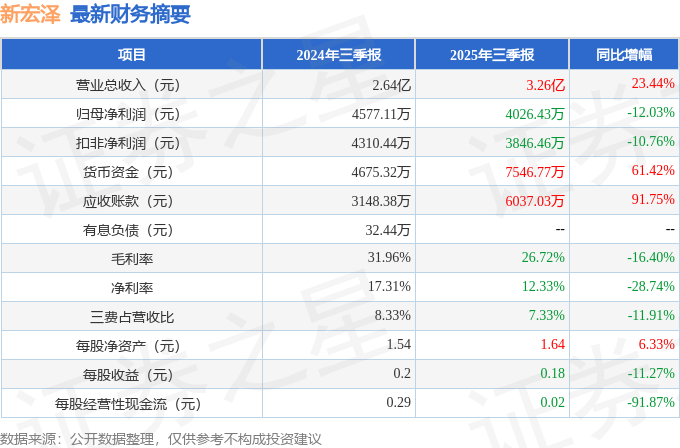 据证券之星公开数据整理,近期新宏泽(002836)发布2025年三季报。截至本报告期末,公司营业总收入3.26亿元,同比上升23.44%,归母净利润4026.43万元,同比下降12.03%。按单季度数据看,第三季度营业总收入1.26亿元,同比上升13.19%,第三季度归母净利润880.12万元,同比下降49.8%。本报告期新宏泽公司应收账款体量较大,当期应收账款占最新年报归母净利润比达96.6%。