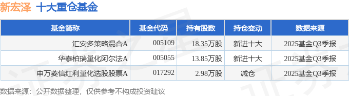 持有新宏泽最多的基金为汇安多策略混合A,目前规模为0.84亿元,最新净值1.5849(10月27日),较上一交易日上涨0.13%,近一年上涨44.67%。该基金现任基金经理为柳预才。