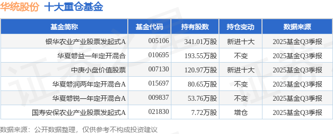 持有华统股份最多的基金为银华农业产业股票发起式A,目前规模为4.36亿元,最新净值1.3581(10月27日),较上一交易日上涨1.85%,近一年上涨2.17%。该基金现任基金经理为唐能。