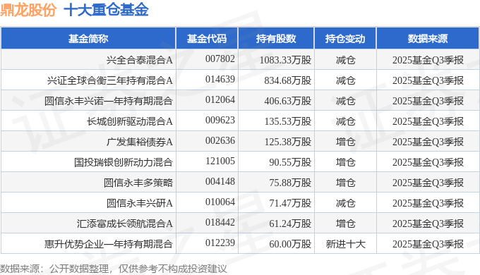 持有鼎龙股份最多的基金为兴全合泰混合A,目前规模为48.16亿元,最新净值1.6432(10月27日),较上一交易日上涨0.54%,近一年上涨23.36%。该基金现任基金经理为任相栋。