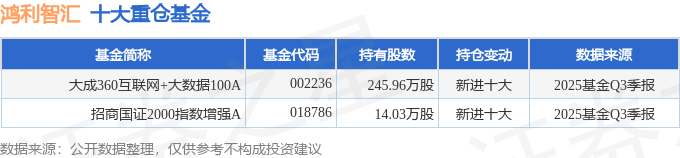持有鸿利智汇最多的基金为大成360互联网+大数据100A,目前规模为7.88亿元,最新净值3.2616(10月27日),较上一交易日上涨0.34%,近一年上涨47.2%。该基金现任基金经理为夏高。