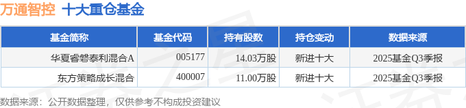 持有万通智控最多的基金为华夏睿磐泰利混合A,目前规模为7.7亿元,最新净值1.4537(10月27日),较上一交易日上涨0.21%,近一年上涨5.46%。该基金现任基金经理为靖博灵 郝彬。