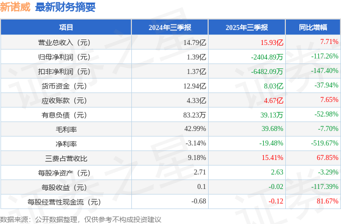 据证券之星公开数据整理,近期新诺威(300765)发布2025年三季报。截至本报告期末,公司营业总收入15.93亿元,同比上升7.71%,归母净利润-2404.89万元,同比下降117.26%。按单季度数据看,第三季度营业总收入5.43亿元,同比上升7.18%,第三季度归母净利润-2130.27万元,同比下降1025.45%。本报告期新诺威三费占比上升明显,财务费用、销售费用和管理费用总和占总营收同比增幅达67.85%。