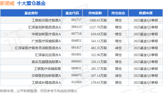 持有新诺威最多的基金为工银前沿医疗股票A,目前规模为96.36亿元,最新净值3.256(10月28日),较上一交易日下跌1.12%,近一年上涨18.28%。该基金现任基金经理为赵蓓。