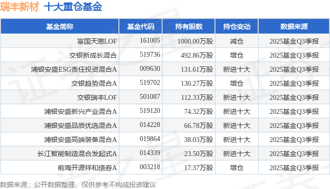 持有瑞丰新材最多的基金为富国天惠LOF,目前规模为226.61亿元,最新净值2.8277(10月28日),较上一交易日下跌0.8%,近一年上涨15.07%。该基金现任基金经理为朱少醒。