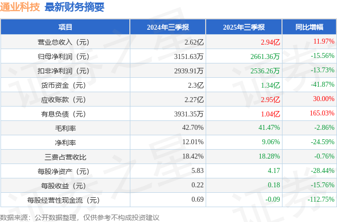 据证券之星公开数据整理,近期通业科技(300960)发布2025年三季报。截至本报告期末,公司营业总收入2.94亿元,同比上升11.97%,归母净利润2661.36万元,同比下降15.56%。按单季度数据看,第三季度营业总收入1.05亿元,同比上升12.7%,第三季度归母净利润773.03万元,同比下降55.32%。本报告期通业科技应收账款上升,应收账款同比增幅达30%。