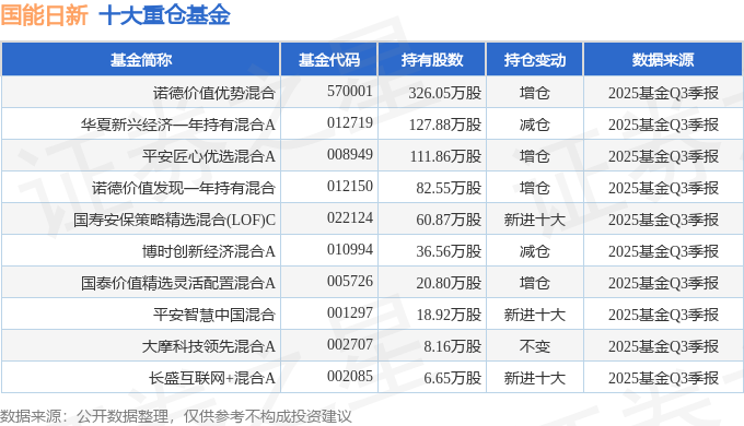 持有国能日新最多的基金为诺德价值优势混合,目前规模为24.81亿元,最新净值2.9899(10月28日),较上一交易日下跌0.91%,近一年上涨41.77%。该基金现任基金经理为罗世锋。