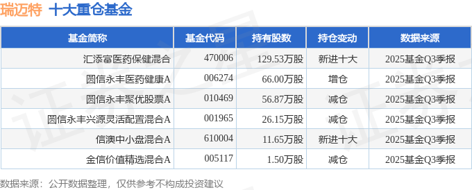持有瑞迈特最多的基金为汇添富医药保健混合,目前规模为24.86亿元,最新净值2.013(10月28日),较上一交易日下跌1.37%,近一年上涨23.55%。该基金现任基金经理为郑磊。