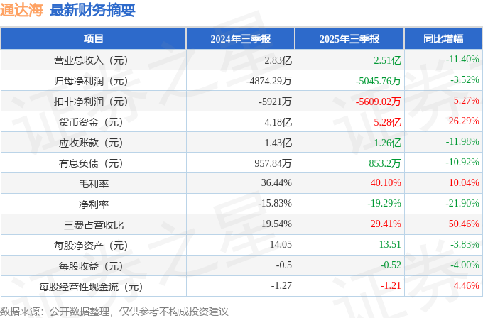 据证券之星公开数据整理,近期通达海(301378)发布2025年三季报。截至本报告期末,公司营业总收入2.51亿元,同比下降11.4%,归母净利润-5045.76万元,同比下降3.52%。按单季度数据看,第三季度营业总收入9790.2万元,同比下降5.26%,第三季度归母净利润-643.01万元,同比上升46.96%。本报告期通达海三费占比上升明显,财务费用、销售费用和管理费用总和占总营收同比增幅达50.46%。