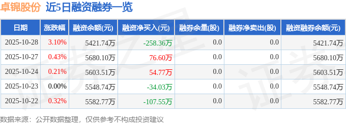 卓锦股份融资融券信息显示,融资方面,当日融资买入67.19万元,融资偿还325.56万元,融资净偿还258.36万元。融券方面,融券卖出0.0股,融券偿还0.0股,融券余量0.0股,融券余额0.0万元。融资融券余额5421.74万元。