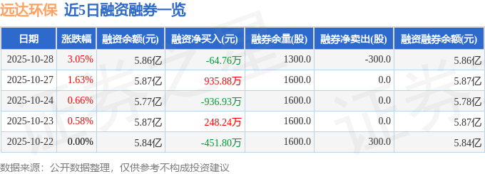 远达环保融资融券信息显示,融资方面,当日融资买入3814.93万元,融资偿还3879.69万元,融资净偿还64.76万元。融券方面,融券卖出0.0股,融券偿还300.0股,融券余量1300.0股,融券余额1.67万元。融资融券余额5.86亿元。