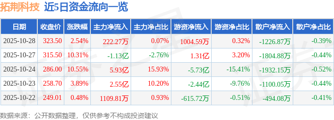 10月28日的资金流向数据方面,主力资金净流入222.27万元,占总成交额0.07%,游资资金净流入1004.59万元,占总成交额0.32%,散户资金净流出1226.87万元,占总成交额0.39%。