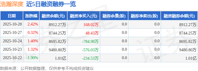 浩瀚深度融资融券信息显示,融资方面,当日融资买入753.3万元,融资偿还585.28万元,融资净买入168.02万元。融券方面,融券卖出0.0股,融券偿还0.0股,融券余量0.0股,融券余额0.0万元。融资融券余额8912.27万元。