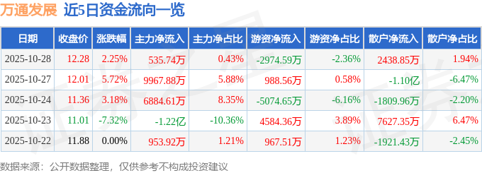 证券之星消息,截至2025年10月28日收盘,万通发展(600246)报收于12.28元,上涨2.25%,换手率5.43%,成交量102.57万手,成交额12.6亿元。