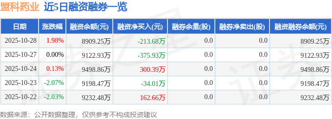 盟科药业融资融券信息显示,融资方面,当日融资买入912.93万元,融资偿还1126.61万元,融资净偿还213.68万元。融券方面,融券卖出0.0股,融券偿还0.0股,融券余量0.0股,融券余额0.0万元。融资融券余额8909.25万元。