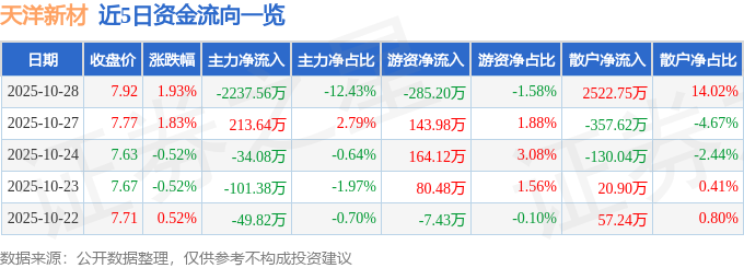 证券之星消息,截至2025年10月28日收盘,天洋新材(603330)报收于7.92元,上涨1.93%,换手率5.51%,成交量22.43万手,成交额1.8亿元。