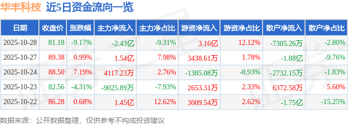 证券之星消息,截至2025年10月28日收盘,华丰科技(688629)报收于81.18元,下跌9.17%,换手率17.4%,成交量31.64万手,成交额26.07亿元。