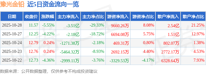 证券之星消息,截至2025年10月28日收盘,豫光金铅(600531)报收于11.57元,下跌5.55%,换手率9.32%,成交量101.56万手,成交额11.96亿元。