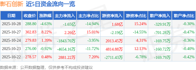 证券之星消息,截至2025年10月28日收盘,影石创新(688775)报收于288.8元,下跌4.63%,换手率12.43%,成交量3.79万手,成交额11.04亿元。