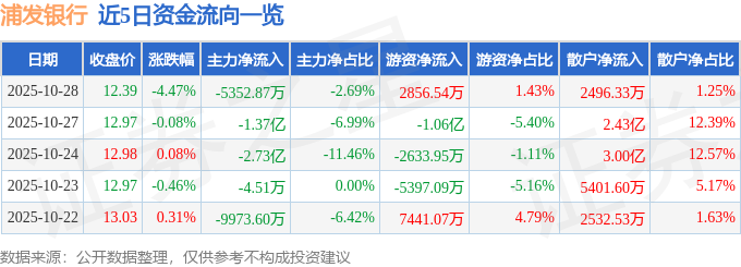 证券之星消息,截至2025年10月28日收盘,浦发银行(600000)报收于12.39元,下跌4.47%,换手率0.48%,成交量159.87万手,成交额19.92亿元。