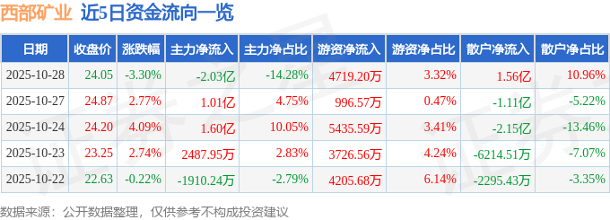 证券之星消息,截至2025年10月28日收盘,西部矿业(601168)报收于24.05元,下跌3.3%,换手率2.45%,成交量58.45万手,成交额14.22亿元。