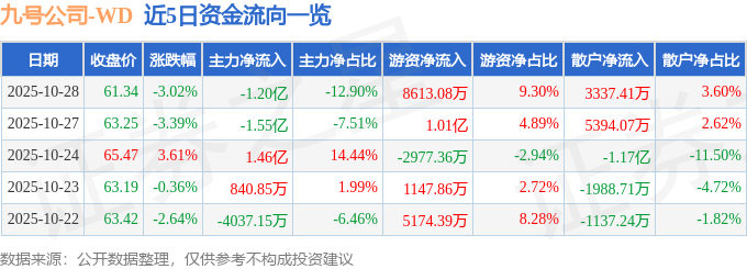 证券之星消息,截至2025年10月28日收盘,九号公司(689009)报收于61.34元,下跌3.02%,换手率2.71%,成交量14.98万手,成交额9.26亿元。