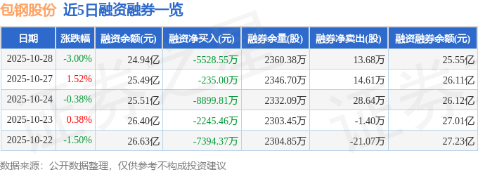 包钢股份融资融券信息显示,融资方面,当日融资买入3.48亿元,融资偿还4.03亿元,融资净偿还5528.55万元。融券方面,融券卖出38.47万股,融券偿还24.79万股,融券余量2360.38万股,融券余额6113.38万元。融资融券余额25.55亿元。