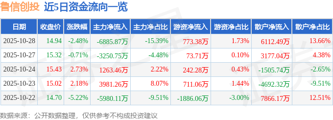 证券之星消息,截至2025年10月28日收盘,鲁信创投(600783)报收于14.94元,下跌2.48%,换手率3.98%,成交量29.62万手,成交额4.47亿元。