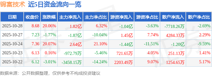 证券之星消息,截至2025年10月28日收盘,锦富技术(300128)报收于8.68元,上涨20.06%,涨停,换手率27.67%,成交量359.09万手,成交额28.73亿元。