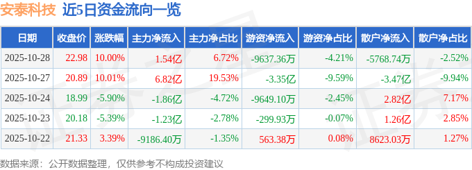 证券之星消息,截至2025年10月28日收盘,安泰科技(000969)报收于22.98元,上涨10.0%,已连续涨停2天,换手率9.72%,成交量100.4万手,成交额22.92亿元。