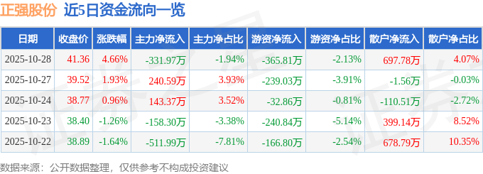 证券之星消息,截至2025年10月28日收盘,正强股份(301119)报收于41.36元,上涨4.66%,换手率4.98%,成交量4.19万手,成交额1.71亿元。