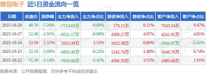证券之星消息,截至2025年10月28日收盘,雅创电子(301099)报收于48.7元,下跌7.2%,换手率18.14%,成交量16.29万手,成交额7.96亿元。