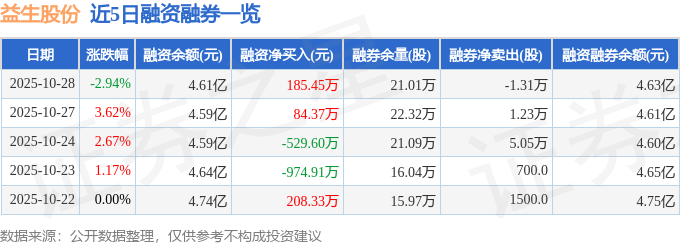 益生股份融资融券信息显示,融资方面,当日融资买入1229.39万元,融资偿还1043.94万元,融资净买入185.45万元。融券方面,融券卖出0.0股,融券偿还1.31万股,融券余量21.01万股,融券余额186.99万元。融资融券余额4.63亿元。
