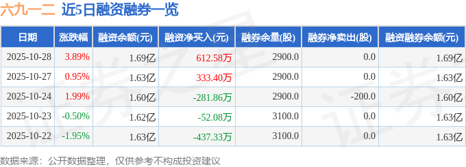 六九一二融资融券信息显示,融资方面,当日融资买入1669.85万元,融资偿还1057.27万元,融资净买入612.58万元。融券方面,融券卖出0.0股,融券偿还0.0股,融券余量2900.0股,融券余额37.96万元。融资融券余额1.69亿元。