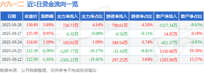 证券之星消息,截至2025年10月28日收盘,六九一二(301592)报收于130.89元,上涨3.89%,换手率5.77%,成交量1.35万手,成交额1.76亿元。