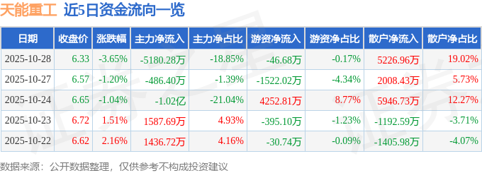 证券之星消息,截至2025年10月28日收盘,天能重工(300569)报收于6.33元,下跌3.65%,换手率4.22%,成交量42.98万手,成交额2.75亿元。
