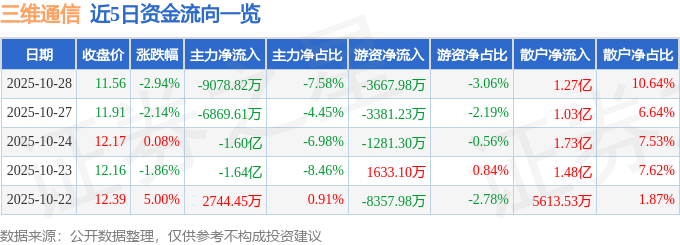 证券之星消息,截至2025年10月28日收盘,三维通信(002115)报收于11.56元,下跌2.94%,换手率13.6%,成交量102.3万手,成交额11.98亿元。