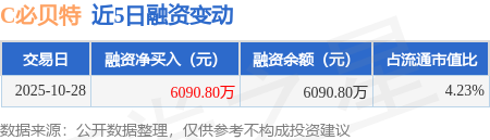 证券之星消息,10月28日,C必贝特(688759)融资买入7496.58万元,融资偿还1405.78万元,融资净买入6090.8万元,融资余额6090.8万元。