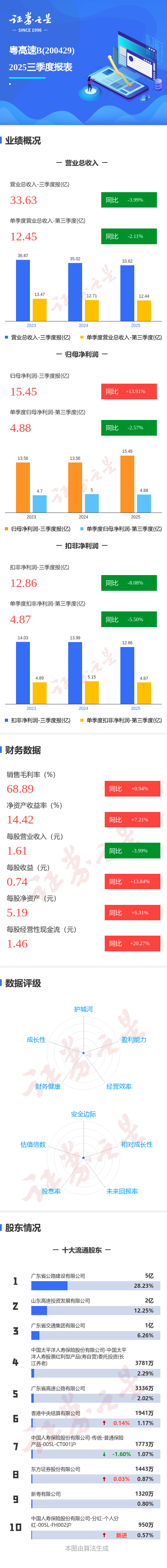 证券之星消息,粤高速B2025年三季报显示,公司主营收入33.63亿元,同比下降3.99%;归母净利润15.45亿元,同比上升13.92%;扣非净利润12.86亿元,同比下降8.09%;其中2025年第三季度,公司单季度主营收入12.45亿元,同比下降2.12%;单季度归母净利润4.88亿元,同比下降2.58%;单季度扣非净利润4.87亿元,同比下降5.51%;负债率42.04%,投资收益2.08亿元,财务费用4766.73万元,毛利率68.89%。