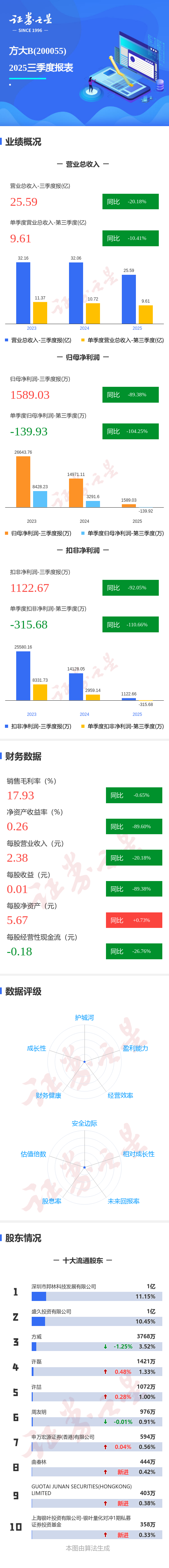 证券之星消息,方大B2025年三季报显示,公司主营收入25.59亿元,同比下降20.19%;归母净利润1589.03万元,同比下降89.39%;扣非净利润1122.67万元,同比下降92.05%;其中2025年第三季度,公司单季度主营收入9.61亿元,同比下降10.41%;单季度归母净利润-139.93万元,同比下降104.25%;单季度扣非净利润-315.68万元,同比下降110.67%;负债率53.24%,投资收益-121.14万元,财务费用6207.59万元,毛利率17.93%。