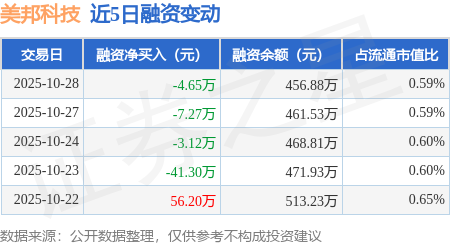 证券之星消息,10月28日,美邦科技(920471)融资买入7.5万元,融资偿还12.15万元,融资净卖出4.65万元,融资余额456.88万元。