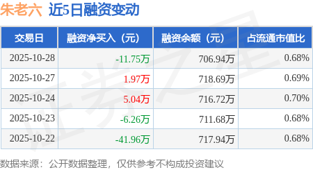 证券之星消息,10月28日,朱老六(920726)融资买入8.73万元,融资偿还20.49万元,融资净卖出11.75万元,融资余额706.94万元。