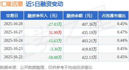 证券之星消息,10月28日,汇隆活塞(920455)融资买入20.01万元,融资偿还47.84万元,融资净卖出27.83万元,融资余额407.36万元。