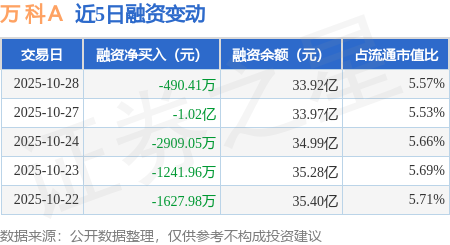 证券之星消息,10月28日,万 科A(000002)融资买入6141.56万元,融资偿还6631.98万元,融资净卖出490.41万元,融资余额33.92亿元。